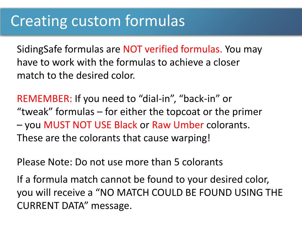 Creating custom formulas SidingSafe formulas are NOT verified formulas. You may have to work with the formulas to achieve a closer match to the desired color. REMEMBER: If you need to “dial-in”, “back-in” or “tweak” formulas – for either the topcoat or the primer – you MUST NOT USE Black or Raw Umber colorants. These are the colorants that cause warping! Please Note: Do not use more than 5 colorants If a formula match cannot be found to your desired color, you will receive a “NO MATCH COULD BE FOUND USING THE CURRENT DATA” message.