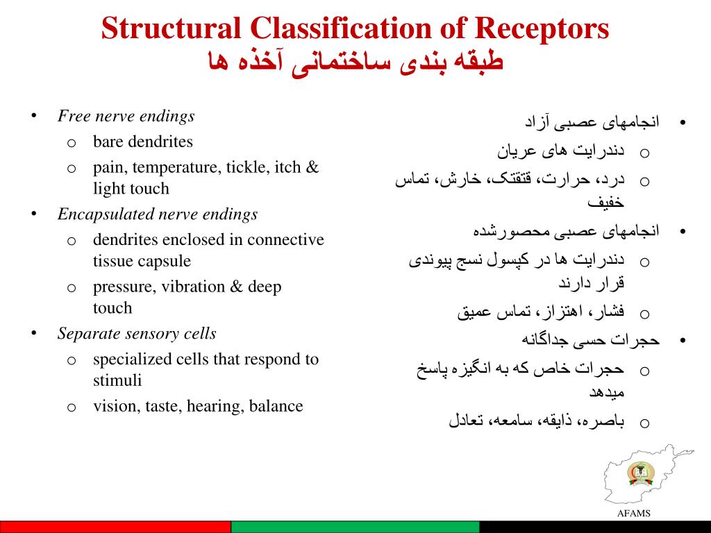 Structural Classification of Receptors طبقه بندی ساختمانی آخذه ها • Free nerve endings • bare dendrites • pain, temperature, tickle, itch & light touch • Encapsulated nerve endings • dendrites enclosed in connective tissue capsule • pressure, vibration & deep touch • Separate sensory cells • specialized cells that respond to stimuli • vision, taste, hearing, balance • انجامهای عصبی آزاد • دندرایت های عریان • درد، حرارت، قتقتک، خارش، تماس خفیف • انجامهای عصبی محصورشده • دندرایت ها در کپسول نسج پیوندی قرار دارند • فشار، اهتزاز، تماس عمیق • حجرات حسی جداگانه • حجرات خاص که به انگیزه پاسخ میدهد • باصره، ذایقه، سامعه، تعادل
