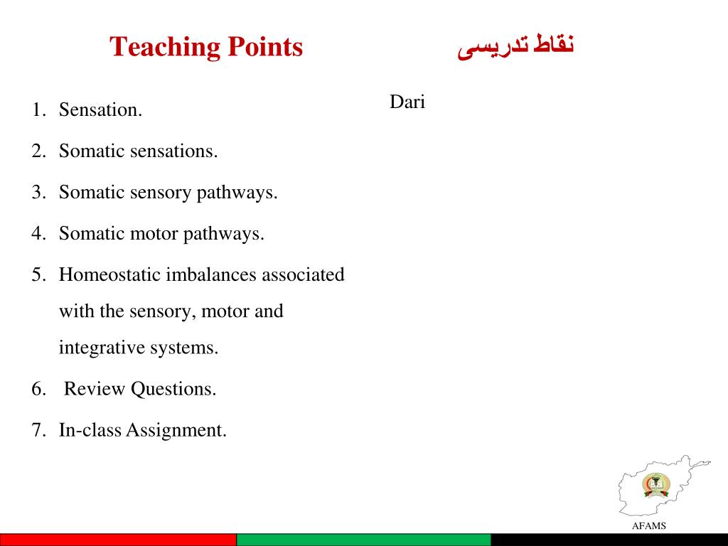 Teaching Points نقاط تدریسی • Sensation. • Somatic sensations. • Somatic sensory pathways. • Somatic motor pathways. • Homeostatic imbalances associated with the sensory, motor and integrative systems. • Review Questions. • In-class Assignment. • Dari