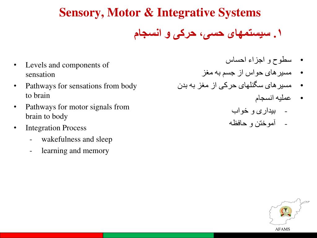 Sensory, Motor & Integrative Systems ۱.سیستمهای حسی، حرکی و انسجام • سطوح و اجزاء احساس • مسیرهای حواس از جسم به مغز • مسیرهای سگنلهای حرکی از مغز به بدن • عملیه انسجام • بیداری و خواب • آموختن و حافظه • Levels and components of sensation • Pathways for sensations from body to brain • Pathways for motor signals from brain to body • Integration Process • wakefulness and sleep • learning and memory