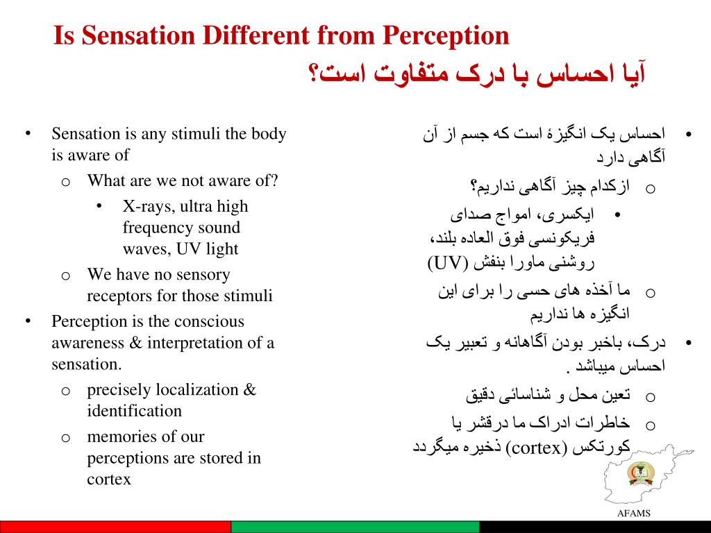 Is Sensation Different from Perception آیا احساس با درک متفاوت است؟ • احساس یک انگیزۀ است که جسم از آن آگاهی دارد • ازکدام چیز آگاهی نداریم؟ • ایکسری، امواج صدای فریکونسی فوق العاده بلند، روشنی ماورا بنفش (UV) • ما آخذه های حسی را برای این انگیزه ها نداریم • درک، باخبر بودن آگاهانه و تعبیر یک احساس میباشد . • تعین محل و شناسائی دقیق • خاطرات ادراک ما درقشر یا کورتکس (cortex) ذخیره میگردد • Sensation is any stimuli the body is aware of • What are we not aware of? • X-rays, ultra high frequency sound waves, UV light • We have no sensory receptors for those stimuli • Perception is the conscious awareness & interpretation of a sensation. • precisely localization & identification • memories of our perceptions are stored in cortex