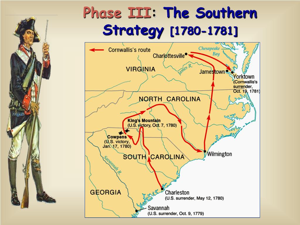 Britain’s “Southern Strategy” • Britain thought that there were more Loyalists in the South. • Southern resources were more valuable/worth preserving. • The British win a number of small victories, but cannot pacify the countryside [similar to U. S. failures in Vietnam!] • Good US General:Nathanial Greene