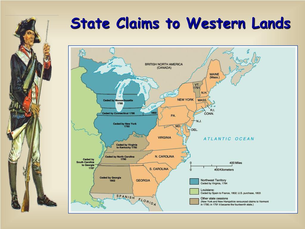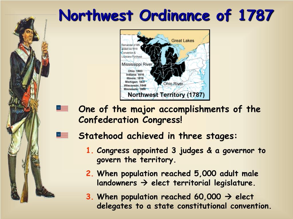 Northwest Ordinance of 1787 • One of the major accomplishments of the Confederation Congress! • Statehood achieved in three stages: • Congress appointed 3 judges & a governor to govern the territory. • When population reached 5,000 adult male landowners elect territorial legislature. • When population reached 60,000 elect delegates to a state constitutional convention.