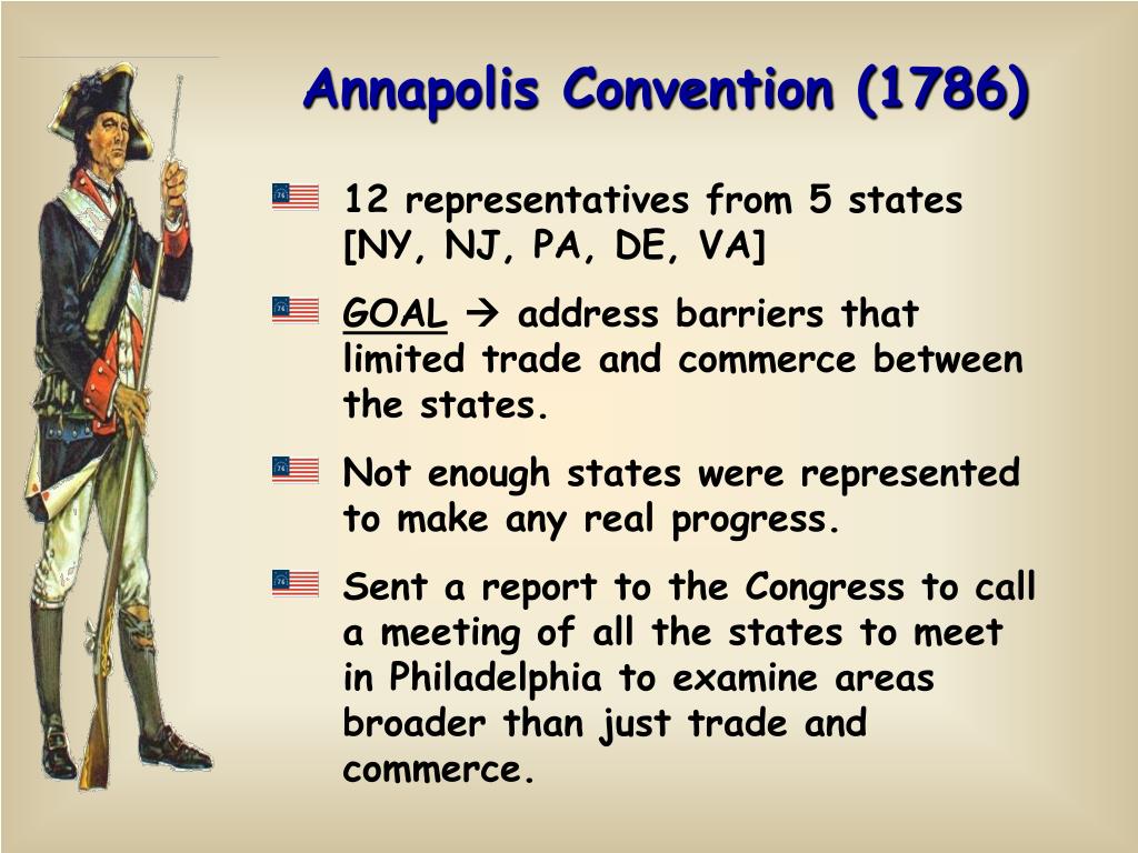 Annapolis Convention (1786) • 12 representatives from 5 states[NY, NJ, PA, DE, VA] • GOAL address barriers that limited trade and commerce between the states. • Not enough states were represented to make any real progress. • Sent a report to the Congress to call a meeting of all the states to meet in Philadelphia to examine areas broader than just trade and commerce.