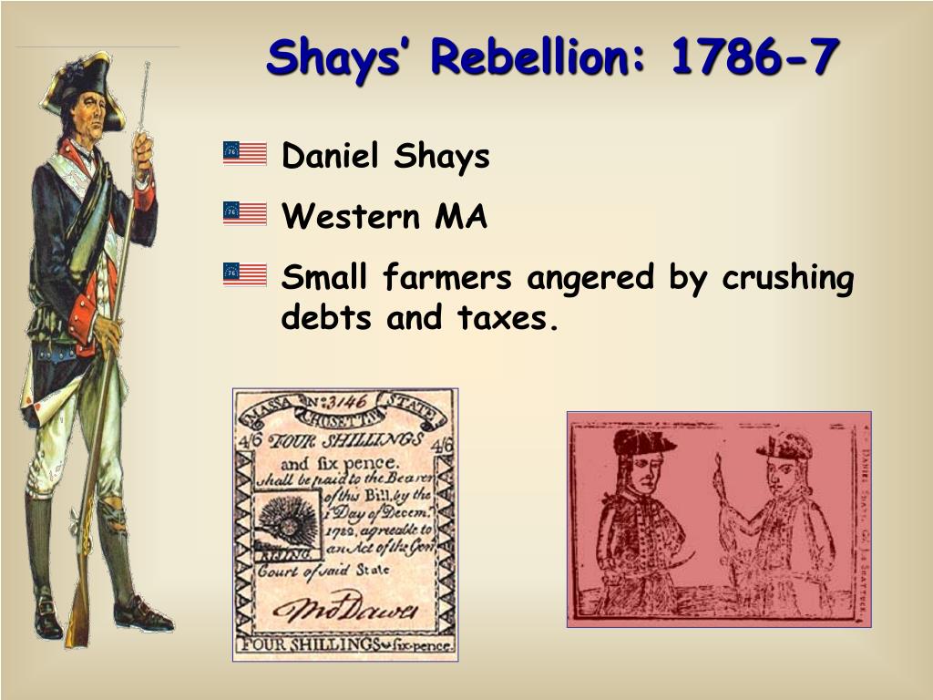Shays’ Rebellion: 1786-7 • Daniel Shays • Western MA • Small farmers angered by crushing debts and taxes.