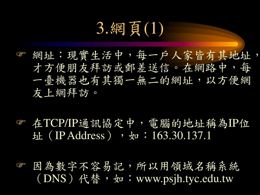 3.網頁(1) • 網址:現實生活中,每一戶人家皆有其地址,才方便朋友拜訪或郵差送信。在網路中,每一臺機器也有其獨一無二的網址,以方便網友上網拜訪。 • 在TCP/IP通訊協定中,電腦的地址稱為IP位址(IP Address),如:163.30.137.1 • 因為數字不容易記,所以用領域名稱系統(DNS)代替,如:www.psjh.tyc.edu.tw