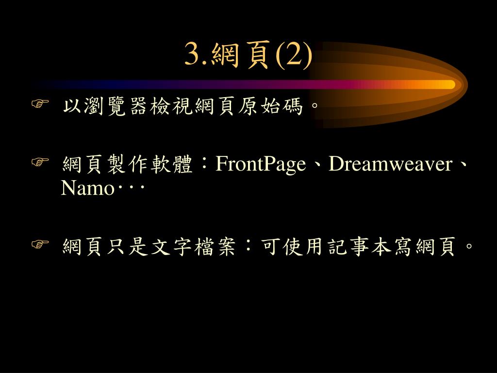 3.網頁(2) • 以瀏覽器檢視網頁原始碼。 • 網頁製作軟體:FrontPage、Dreamweaver、Namo‧‧‧ • 網頁只是文字檔案:可使用記事本寫網頁。