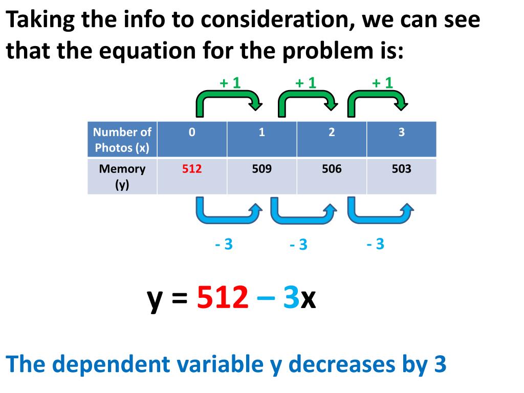 Taking the info to consideration, we can see that the equation for the problem is: + 1 + 1 + 1 - 3 - 3 - 3 y = 512 – 3x The dependent variable y decreases by 3