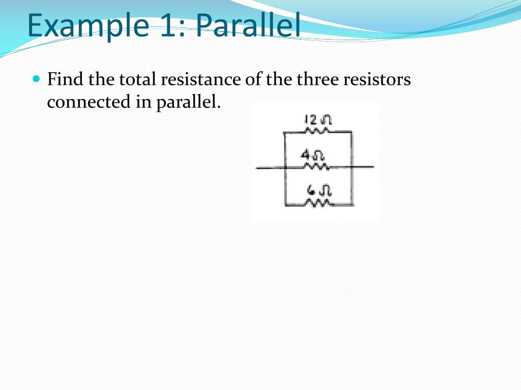Example 1: Parallel • Find the total resistance of the three resistors connected in parallel.