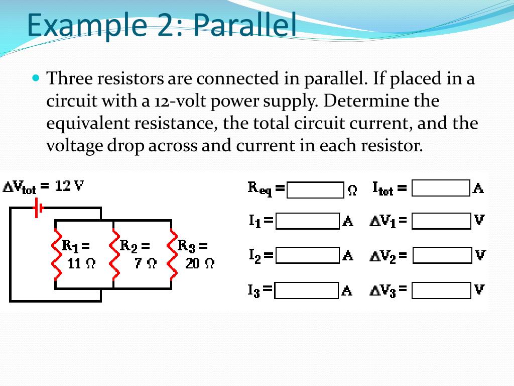 Example 2: Parallel • Three resistors are connected in parallel. If placed in a circuit with a 12-volt power supply. Determine the equivalent resistance, the total circuit current, and the voltage drop across and current in each resistor.