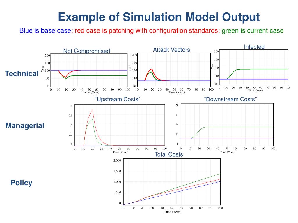 Infected Attack Vectors Not Compromised 200 Technical 150 Year 100 “Upstream Costs” “Downstream Costs” 50 200 0 20 0 10 20 30 40 50 60 70 80 90 100 170 200 Time (Year) Managerial 17 Year 140 170 14 Year 10 110 140 11 7.5 80 110 2,000 0 10 20 30 40 50 60 70 80 90 100 8 5 Time (Year) 0 10 20 30 40 50 60 70 80 90 100 80 Total Costs 1,500 Time (Year) 0 10 20 30 40 50 60 70 80 90 100 2.5 Time (Year) 1,000 0 0 10 20 30 40 50 60 70 80 90 100 500 Time (Year) Policy 0 0 10 20 30 40 50 60 70 80 90 100 Time (Year) Example of Simulation Model Output Blue is base case; red case is patching with configuration standards; green is current case