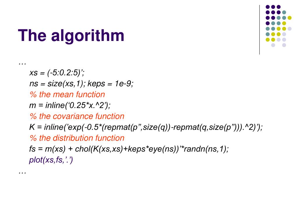 The algorithm … xs = (-5:0.2:5)’; ns = size(xs,1); keps = 1e-9; % the mean function m = inline(‘0.25*x.^2’); % the covariance function K = inline(’exp(-0.5*(repmat(p’’,size(q))-repmat(q,size(p’’))).^2)’); % the distribution function fs = m(xs) + chol(K(xs,xs)+keps*eye(ns))’*randn(ns,1); plot(xs,fs,’.’) …