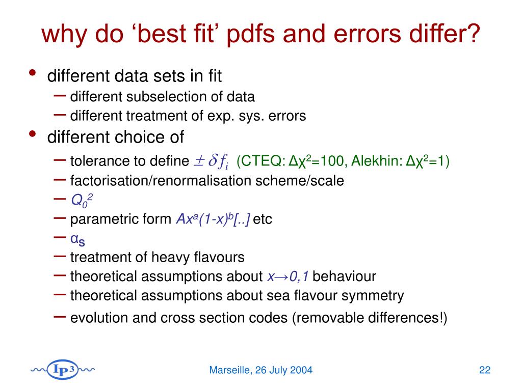 why do ‘best fit’ pdfs and errors differ? • different data sets in fit • different subselection of data • different treatment of exp. sys. errors • different choice of • tolerance to define fi(CTEQ: Δχ2=100, Alekhin: Δχ2=1) • factorisation/renormalisation scheme/scale • Q02 • parametric form Axa(1-x)b[..] etc • αS • treatment of heavy flavours • theoretical assumptions about x→0,1 behaviour • theoretical assumptions about sea flavour symmetry • evolution and cross section codes (removable differences!) Marseille, 26 July 2004
