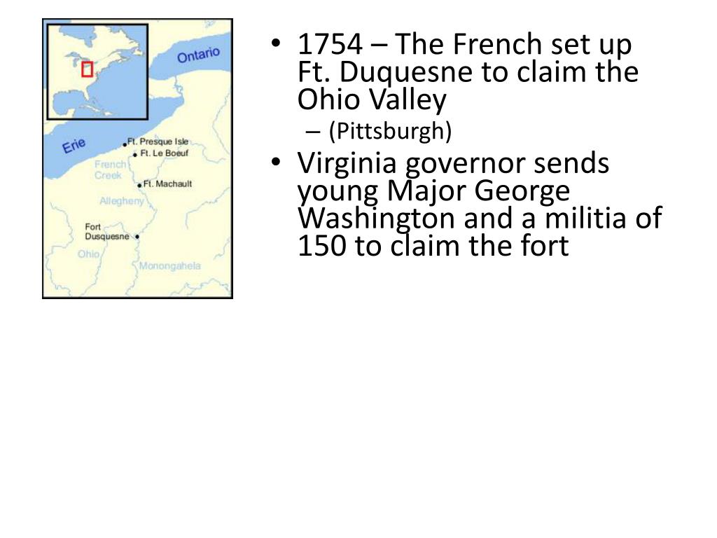 1754 – The French set up Ft. Duquesne to claim the Ohio Valley • (Pittsburgh) • Virginia governor sends young Major George Washington and a militia of 150 to claim the fort