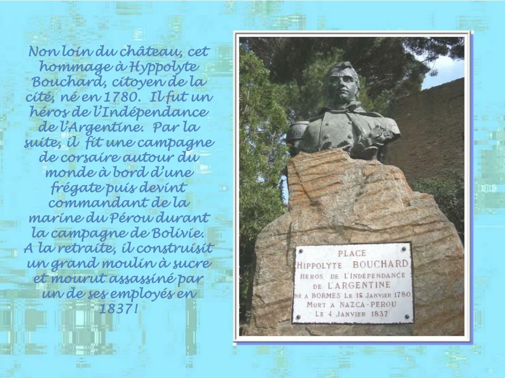 Non loin du château, cet hommage à Hyppolyte Bouchard, citoyen de la cité, né en 1780. Il fut un héros de l’Indépendance de l’Argentine. Par la suite, il fit une campagne de corsaire autour du monde à bord d’une frégate puis devint commandant de la marine du Pérou durant la campagne de Bolivie. A la retraite, il construisit un grand moulin à sucre et mourut assassiné par un de ses employés en 1837!