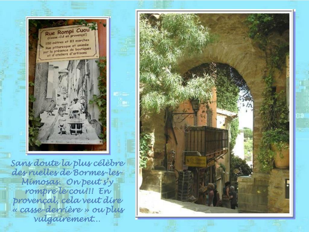 Sans doute la plus célèbre des ruelles de Bormes-les- Mimosas. On peut s’y rompre le cou!!! En provençal, cela veut dire « casse-derrière » ou plus vulgairement…
