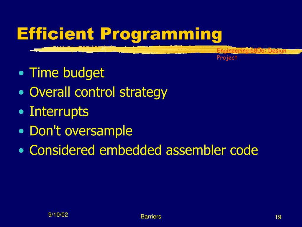 Efficient Programming • Time budget • Overall control strategy • Interrupts • Don't oversample • Considered embedded assembler code Barriers