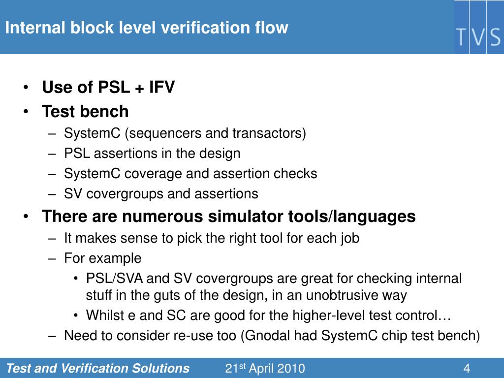 Internal block level verification flow • Use of PSL + IFV • Test bench • SystemC (sequencers and transactors) • PSL assertions in the design • SystemC coverage and assertion checks • SV covergroups and assertions • There are numerous simulator tools/languages • It makes sense to pick the right tool for each job • For example • PSL/SVA and SV covergroups are great for checking internal stuff in the guts of the design, in an unobtrusive way • Whilst e and SC are good for the higher-level test control… • Need to consider re-use too (Gnodal had SystemC chip test bench)