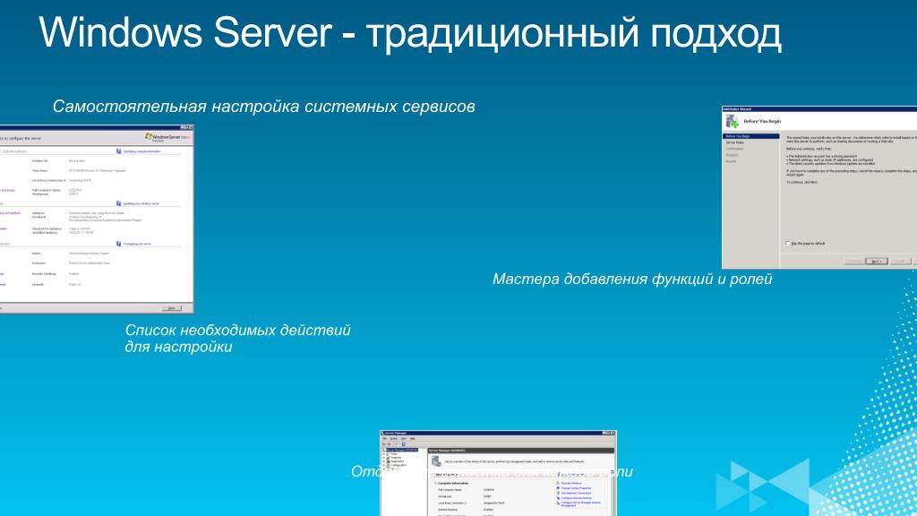Windows Server - традиционный подход Самостоятельная настройка системных сервисов • Мастера добавления функций и ролей • Список необходимых действий для настройки • Отдельные оснастки для каждой роли