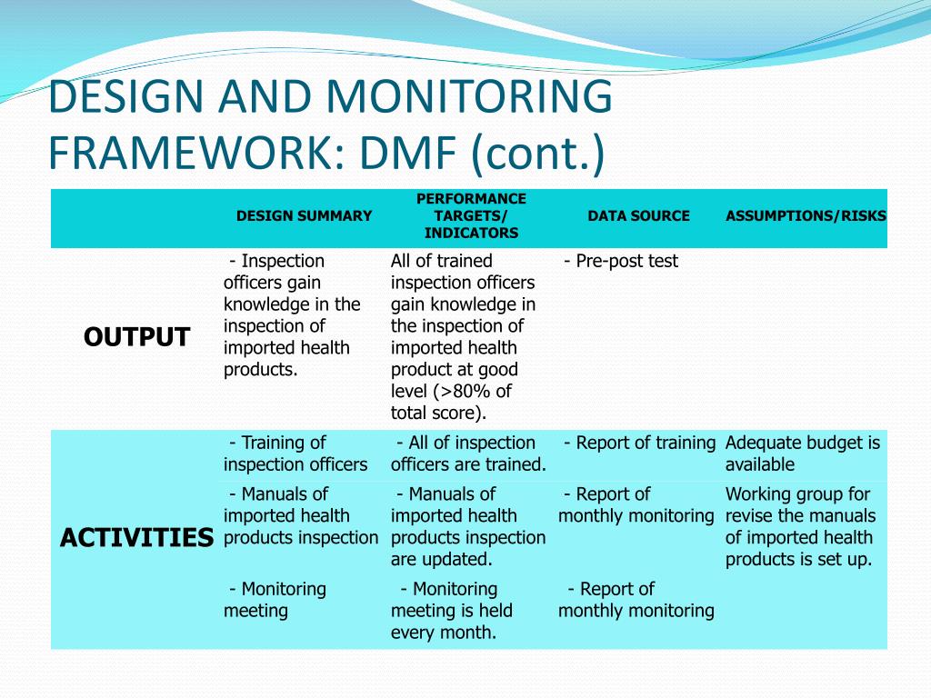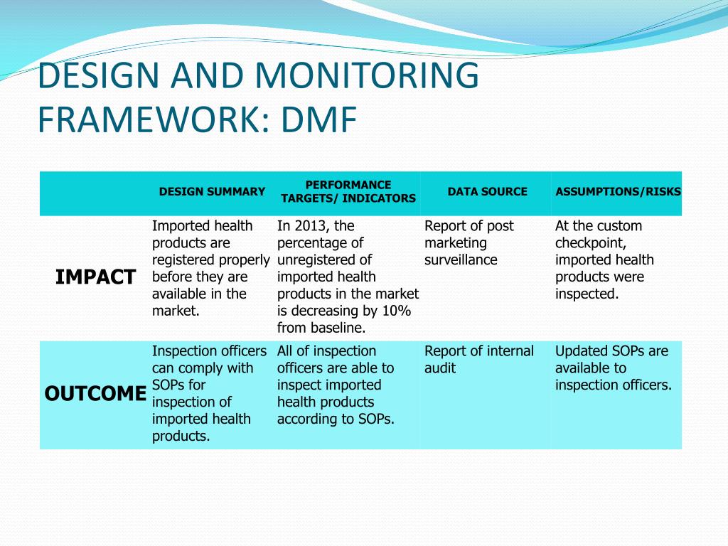 This presentation outlines the design and monitoring framework, work breakdown structure, stakeholder analysis, and monitoring and evaluation plan for building capacity in the inspection of imported health products. Topics include pre-training, training sessions, stakeholder engagement, and implementation planning.