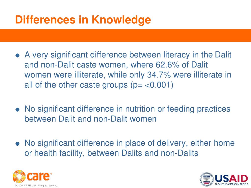 Differences in Knowledge A very significant difference between literacy in the Dalit and non-Dalit caste women, where 62.6% of Dalit women were illiterate, while only 34.7% were illiterate in all of the other caste groups (p= <0.001) No significant difference in nutrition or feeding practices between Dalit and non-Dalit women No significant difference in place of delivery, either home or health facility, between Dalits and non-Dalits