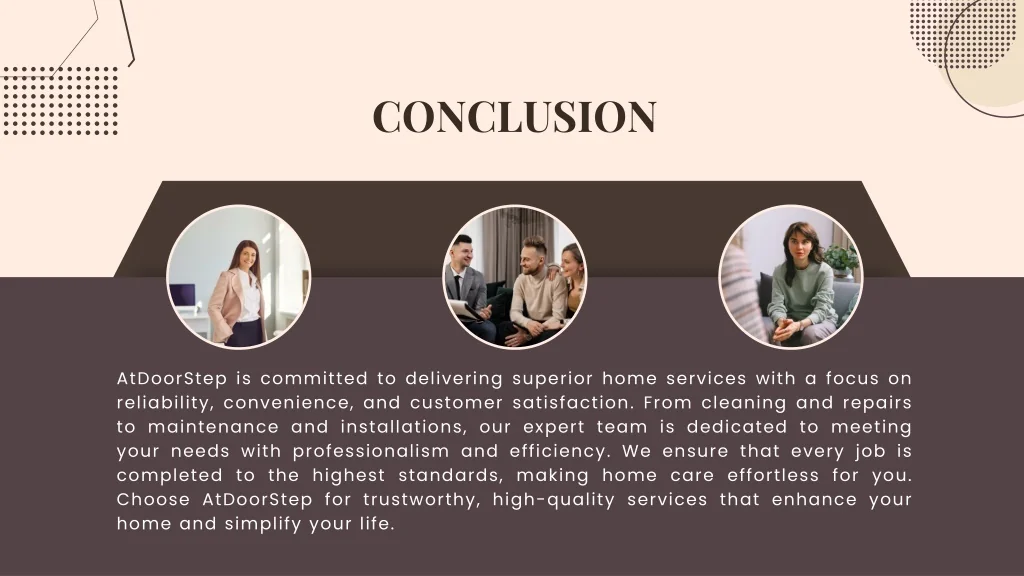 CONCLUSION AtDoorStep is committed to delivering superior home services with a focus on reliability, convenience, and customer satisfaction. From cleaning and repairs to maintenance and installations, our expert team is dedicated to meeting your needs with professionalism and efficiency. We ensure that every job is completed to the highest standards, making home care effortless for you. Choose AtDoorStep for trustworthy, high-quality services that enhance your home and simplify your life.