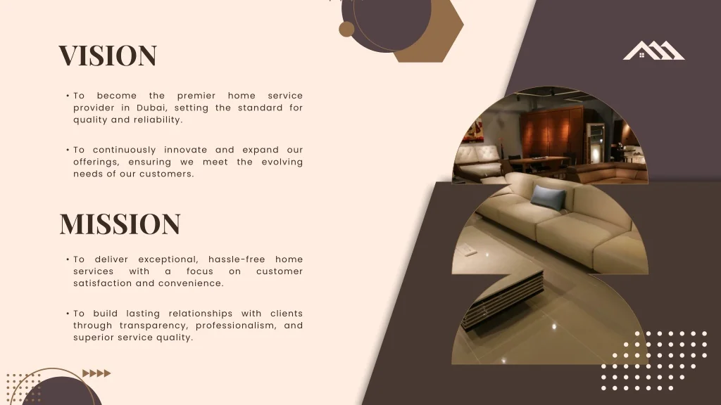 VISION • To become the premier home service provider in Dubai, setting the standard for quality and reliability. • To continuously innovate and expand our offerings, ensuring we meet the evolving needs of our customers. MISSION • To deliver exceptional, hassle-free home services with a focus on customer satisfaction and convenience. • To build lasting relationships with clients through transparency, professionalism, and superior service quality.