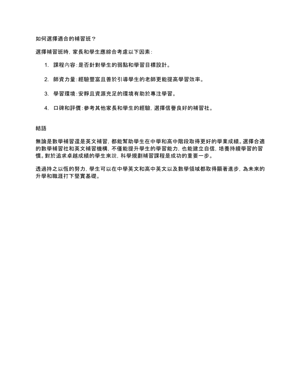 如何選擇適合的補習班? 選擇補習班時,家長和學生應綜合考慮以下因素: 1. 課程內容:是否針對學生的弱點和學習目標設計。 2. 師資力量:經驗豐富且善於引導學生的老師更能提高學習效率。 3. 學習環境:安靜且資源充足的環境有助於專注學習。 4. 口碑和評價:參考其他家長和學生的經驗,選擇信譽良好的補習社。 結語 無論是數學補習還是英文補習,都能幫助學生在中學和高中階段取得更好的學業成績。選擇合適 的數學補習社和英文補習機構,不僅能提升學生的學習能力,也能建立自信,培養持續學習的習 慣。對於追求卓越成績的學生來說,科學規劃補習課程是成功的重要一步。 透過持之以恆的努力,學生可以在中學英文和高中英文以及數學領域都取得顯著進步,為未來的 升學和職涯打下堅實基礎。