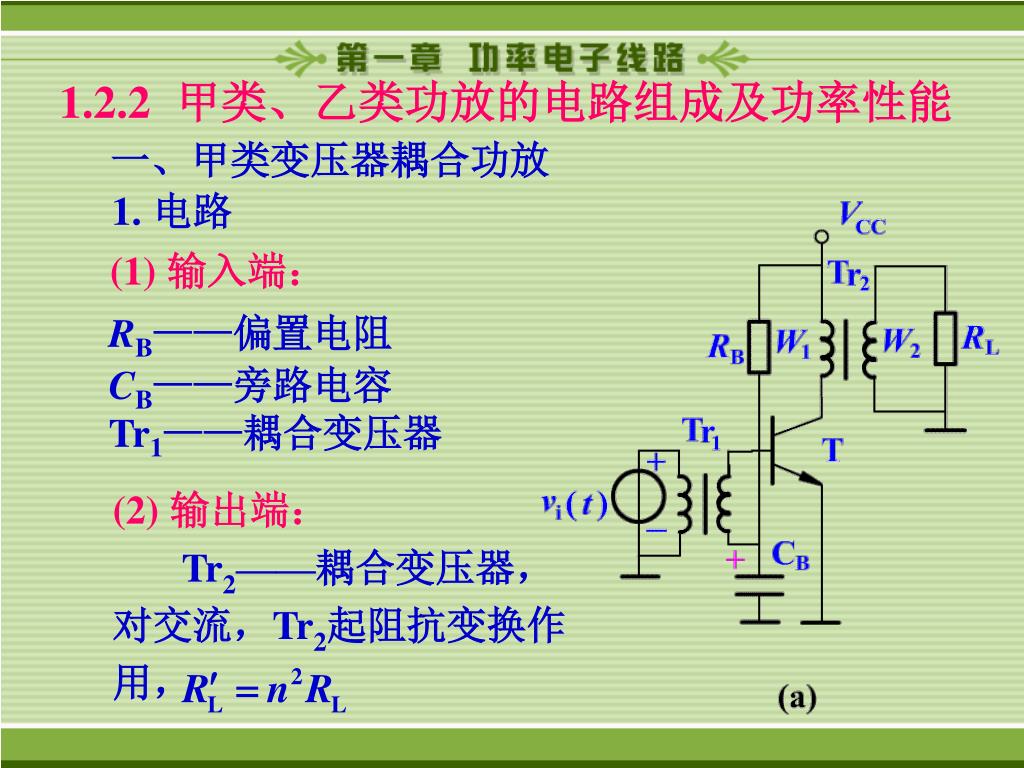 Tr2——耦合变压器,对交流,Tr2起阻抗变换作用,Tr2——耦合变压器,对交流,Tr2起阻抗变换作用, 1.2.2甲类、乙类功放的电路组成及功率性能 一、甲类变压器耦合功放 1.电路 (1)输入端: RB——偏置电阻 CB——旁路电容 Tr1——耦合变压器 (2)输出端: