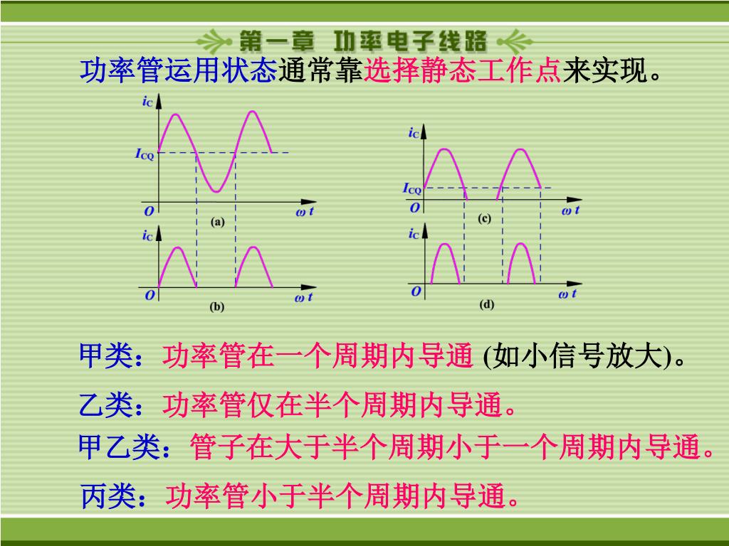 功率管运用状态通常靠选择静态工作点来实现。功率管运用状态通常靠选择静态工作点来实现。 甲类:功率管在一个周期内导通(如小信号放大)。 乙类:功率管仅在半个周期内导通。 甲乙类:管子在大于半个周期小于一个周期内导通。 丙类:功率管小于半个周期内导通。