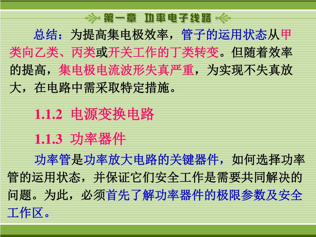 总结:为提高集电极效率,管子的运用状态从甲类向乙类、丙类或开关工作的丁类转变。但随着效率的提高,集电极电流波形失真严重,为实现不失真放大,在电路中需采取特定措施。总结:为提高集电极效率,管子的运用状态从甲类向乙类、丙类或开关工作的丁类转变。但随着效率的提高,集电极电流波形失真严重,为实现不失真放大,在电路中需采取特定措施。 1.1.2 电源变换电路 1.1.3 功率器件 功率管是功率放大电路的关键器件,如何选择功率管的运用状态,并保证它们安全工作是需要共同解决的问题。为此,必须首先了解功率器件的极限参数及安全工作区。