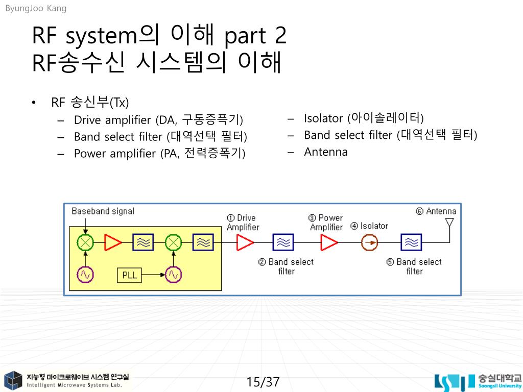 RF송신부(Tx) • Drive amplifier (DA, 구동증픅기) • Band select filter (대역선택 필터) • Power amplifier (PA, 전력증폭기) • Isolator (아이솔레이터) • Band select filter (대역선택 필터) • Antenna ByungJoo Kang RF system의 이해 part 2RF송수신 시스템의 이해