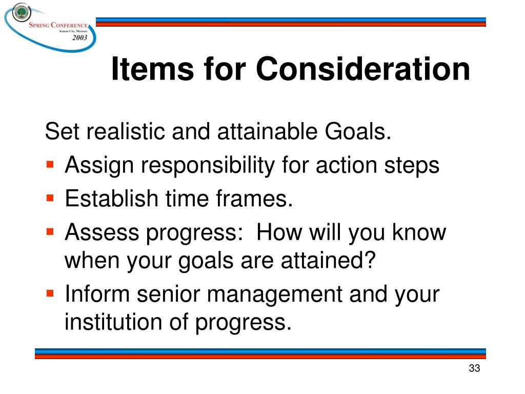 Items for Consideration Set realistic and attainable Goals. • Assign responsibility for action steps • Establish time frames. • Assess progress: How will you know when your goals are attained? • Inform senior management and your institution of progress.