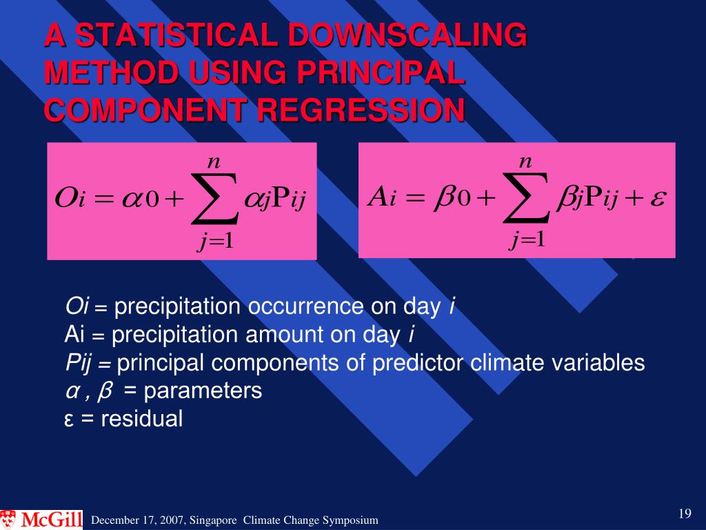 A STATISTICAL DOWNSCALING METHOD USING PRINCIPAL COMPONENT REGRESSION Oi = precipitation occurrence on day i Ai = precipitation amount on day i Pij = principal components of predictor climate variables α , β = parameters ε = residual