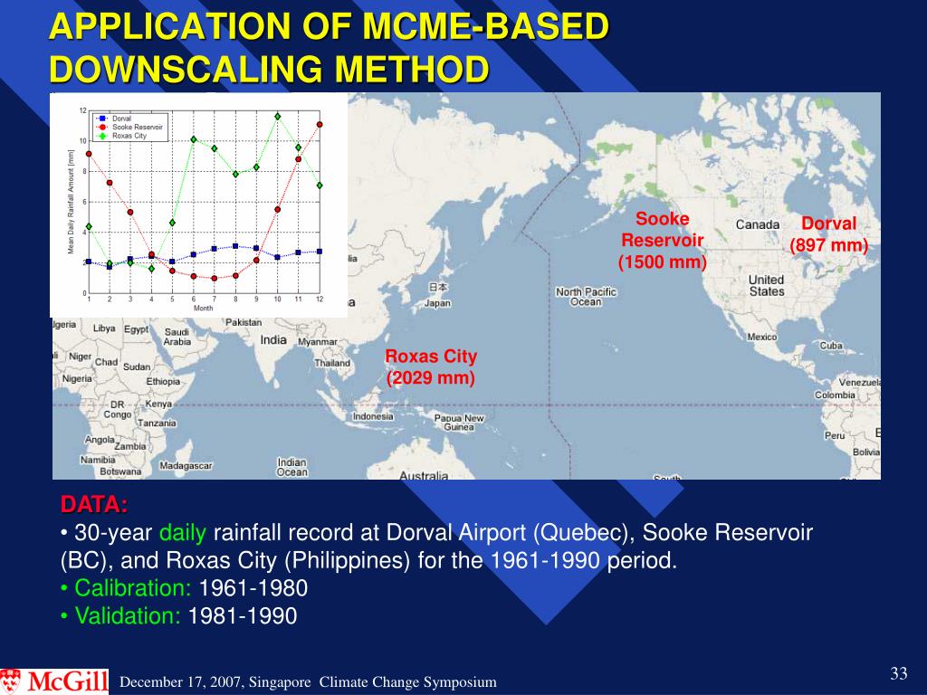 APPLICATION OF MCME-BASED DOWNSCALING METHOD Sooke Reservoir (1500 mm) Dorval (897 mm) Roxas City (2029 mm) • DATA: • 30-year daily rainfall record at Dorval Airport (Quebec), Sooke Reservoir (BC), and Roxas City (Philippines) for the 1961-1990 period. • Calibration: 1961-1980 • Validation: 1981-1990