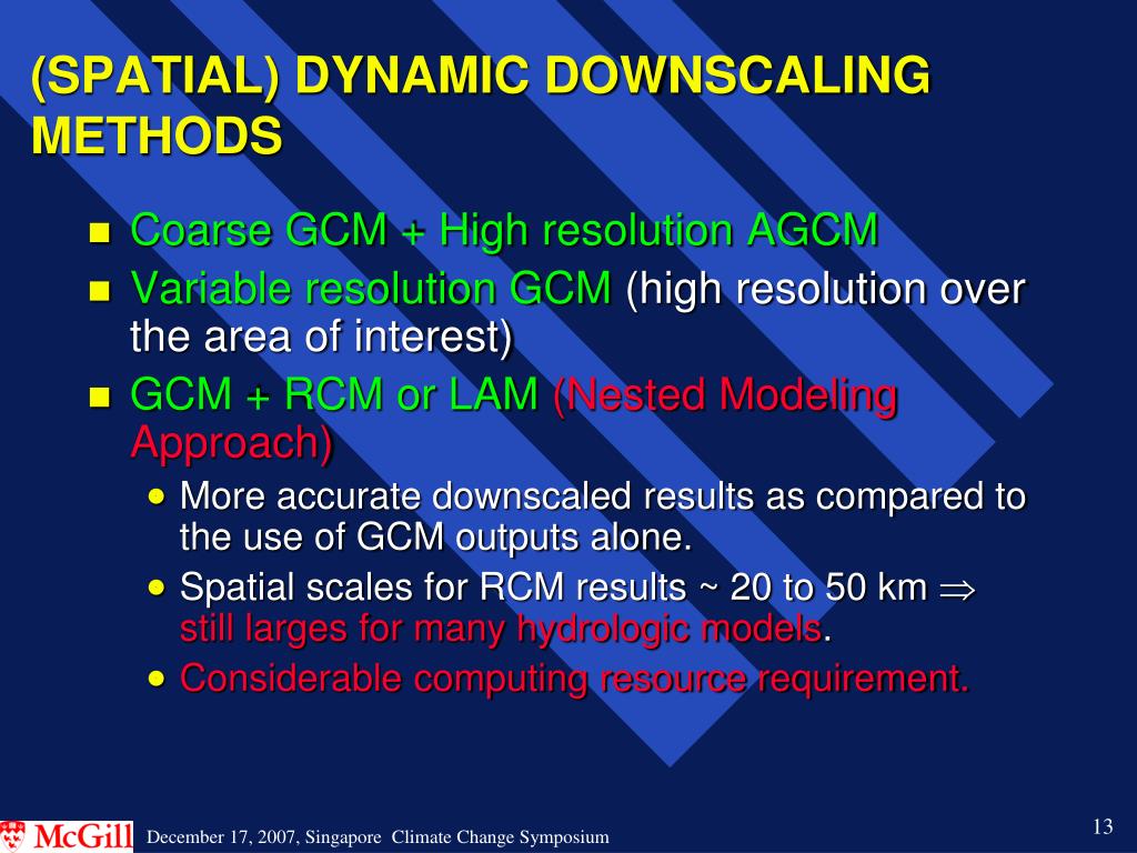 (SPATIAL) DYNAMIC DOWNSCALING METHODS • Coarse GCM + High resolution AGCM • Variable resolution GCM (high resolution over the area of interest) • GCM + RCM or LAM (Nested Modeling Approach) • More accurate downscaled results as compared to the use of GCM outputs alone. • Spatial scales for RCM results ~ 20 to 50 km still larges for many hydrologic models. • Considerable computing resource requirement.