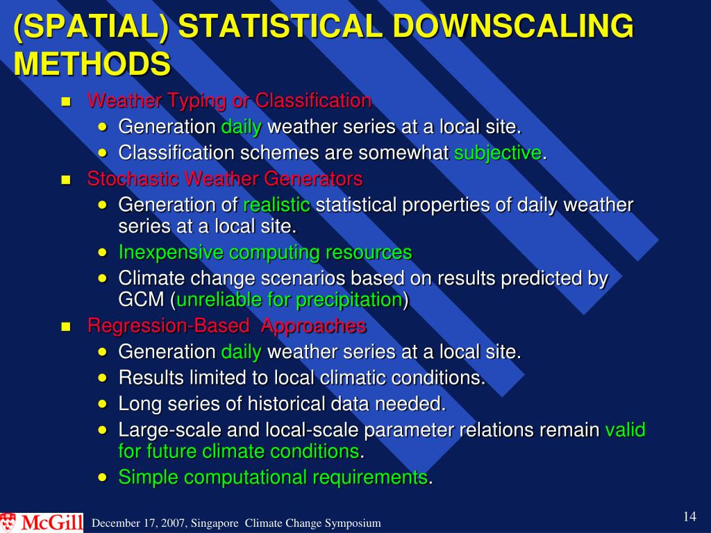 (SPATIAL) STATISTICAL DOWNSCALING METHODS • Weather Typing or Classification • Generation daily weather series at a local site. • Classification schemes are somewhat subjective. • Stochastic Weather Generators • Generation of realistic statistical properties of daily weather series at a local site. • Inexpensive computing resources • Climate change scenarios based on results predicted by GCM (unreliable for precipitation) • Regression-Based Approaches • Generation daily weather series at a local site. • Results limited to local climatic conditions. • Long series of historical data needed. • Large-scale and local-scale parameter relations remain valid for future climate conditions. • Simple computational requirements.