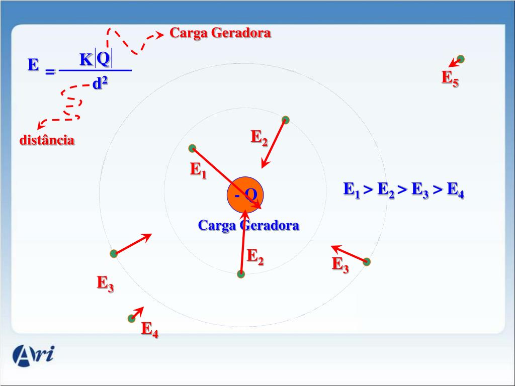 Carga Geradora Q K E = E5 d2 E2 distância E1 E1 > E2 >E3> E4 - Q Carga Geradora E2 E3 E3 E4