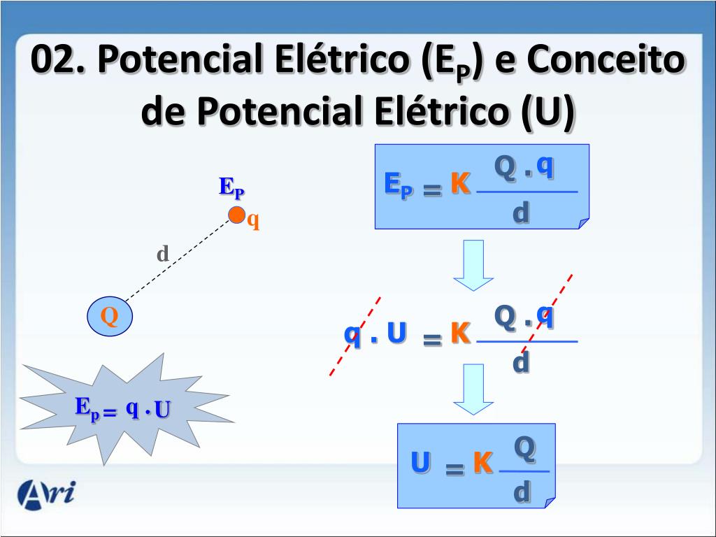 02. Potencial Elétrico (EP) e Conceito de Potencial Elétrico (U) q Q . EP K EP = d q d q Q . Q q . U K = d Ep q . U = Q U K = d