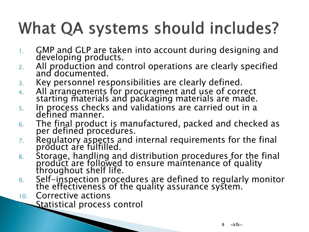 What QA systems should includes? ~kfk~ GMP and GLP are taken into account during designing and developing products. All production and control operations are clearly specified and documented. Key personnel responsibilities are clearly defined. All arrangements for procurement and use of correct starting materials and packaging materials are made. In process checks and validations are carried out in a defined manner. The final product is manufactured, packed and checked as per defined procedures. Regulatory aspects and internal requirements for the final product are fulfilled. Storage, handling and distribution procedures for the final product are followed to ensure maintenance of quality throughout shelf life. Self-inspection procedures are defined to regularly monitor the effectiveness of the quality assurance system. Corrective actions Statistical process control