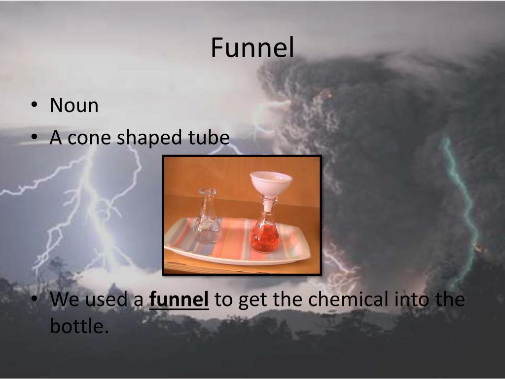 Funnel • Noun • A cone shaped tube • We used a funnel to get the chemical into the bottle.