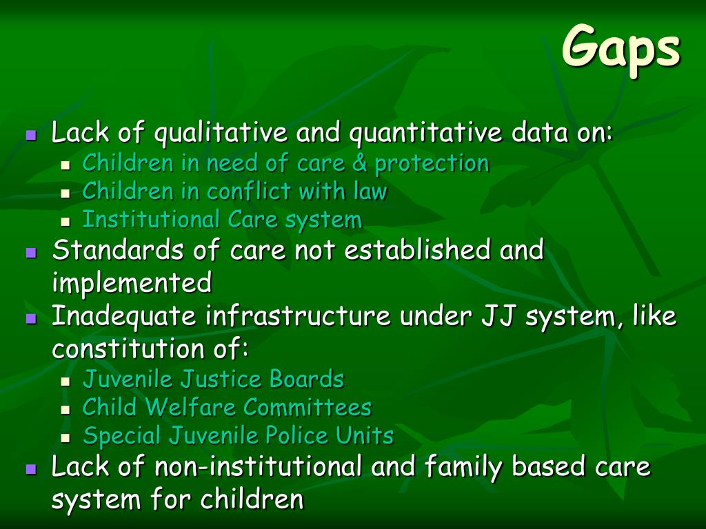 Gaps • Lack of qualitative and quantitative data on: • Children in need of care & protection • Children in conflict with law • Institutional Care system • Standards of care not established and implemented • Inadequate infrastructure under JJ system, like constitution of: • Juvenile Justice Boards • Child Welfare Committees • Special Juvenile Police Units • Lack of non-institutional and family based care system for children