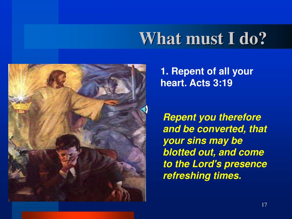 Whatmust I do? 1. Repentof allyourheart. Acts 3:19 Repent you therefore and be converted, that your sins may be blotted out, and come to the Lord's presence refreshing times.