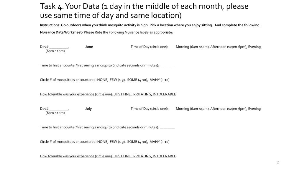 Task 4. Your Data (1 day in the middle of each month, please use same time of day and same location) Instructions: Go outdoors when you think mosquito activity is high. Pick a location where you enjoy sitting. And complete the following. Nuisance Data Worksheet- Please Rate the Following Nuisance levels as appropriate: Day# __________, June Time of Day (circle one): Morning (6am-11am), Afternoon (12pm-6pm), Evening (6pm-11pm) Time to first encounter/first seeing a mosquito (indicate seconds or minutes): ________ Circle # of mosquitoes encountered: NONE, FEW (1-3), SOME (4-10), MANY (+ 10) How tolerable was your experience (circle one): JUST FINE, IRRITATING, INTOLERABLE Day# __________, July Time of Day (circle one): Morning (6am-11am), Afternoon (12pm-6pm), Evening (6pm-11pm) Time to first encounter/first seeing a mosquito (indicate seconds or minutes): ________ Circle # of mosquitoes encountered: NONE, FEW (1-3), SOME (4-10), MANY (+ 10) How tolerable was your experience (circle one): JUST FINE, IRRITATING, INTOLERABLE Day# __________, August Time of Day (circle one): Morning (6am-11am), Afternoon (12pm-6pm), Evening (6pm-11pm) Time to first encounter/first seeing a mosquito(indicate seconds or minutes): ________ Circle # of mosquitoes encountered: NONE, FEW (1-3), SOME (4-10), MANY (+ 10) How tolerable was your experience (circle one): JUST FINE, IRRITATING, INTOLERABLE