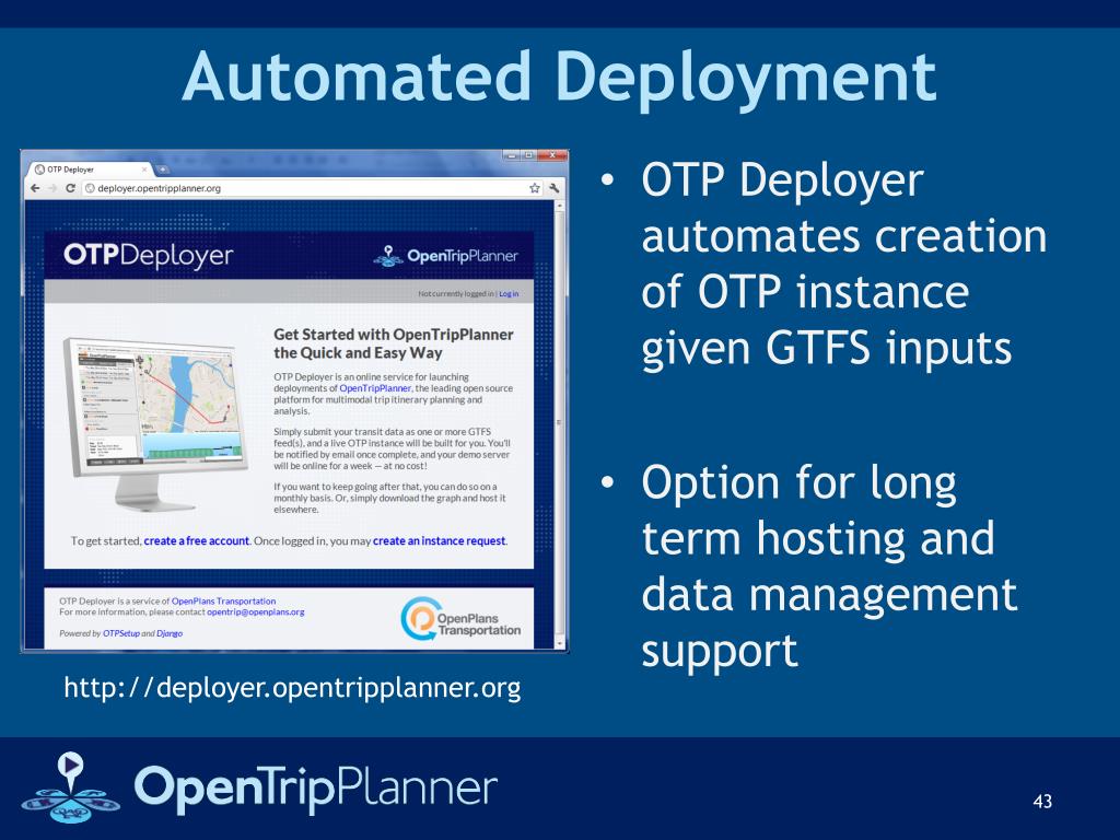Automated Deployment • OTP Deployer automates creation of OTP instance given GTFS inputs • Option for long term hosting and data management support http://deployer.opentripplanner.org