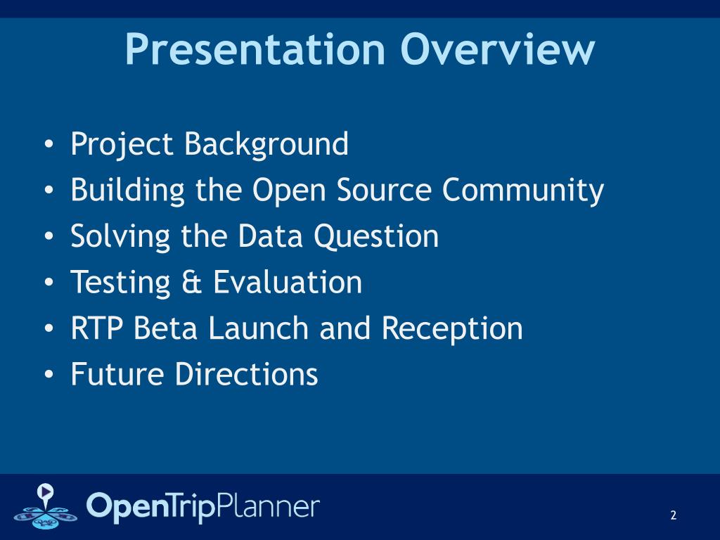 Presentation Overview • Project Background • Building the Open Source Community • Solving the Data Question • Testing & Evaluation • RTP Beta Launch and Reception • Future Directions