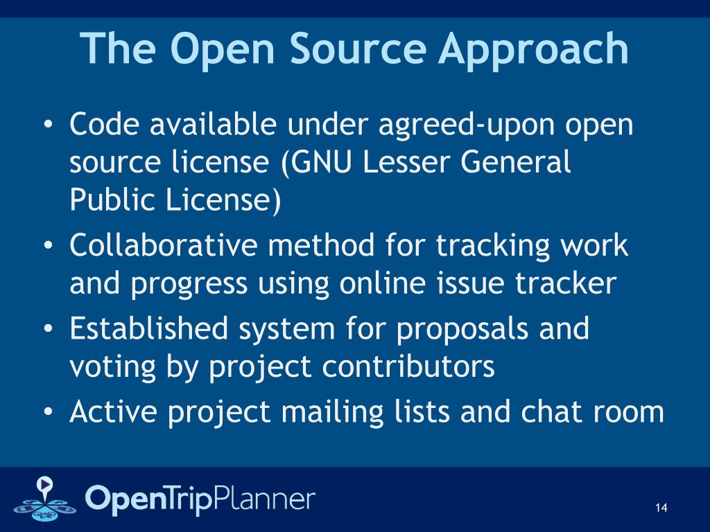 Why Open Source? • Proprietary solutions often cost-prohibitive • Early innovation in multimodal routing driven largely by open source projects • Challenge: build unified multimodal routing platform with strong user/developer community