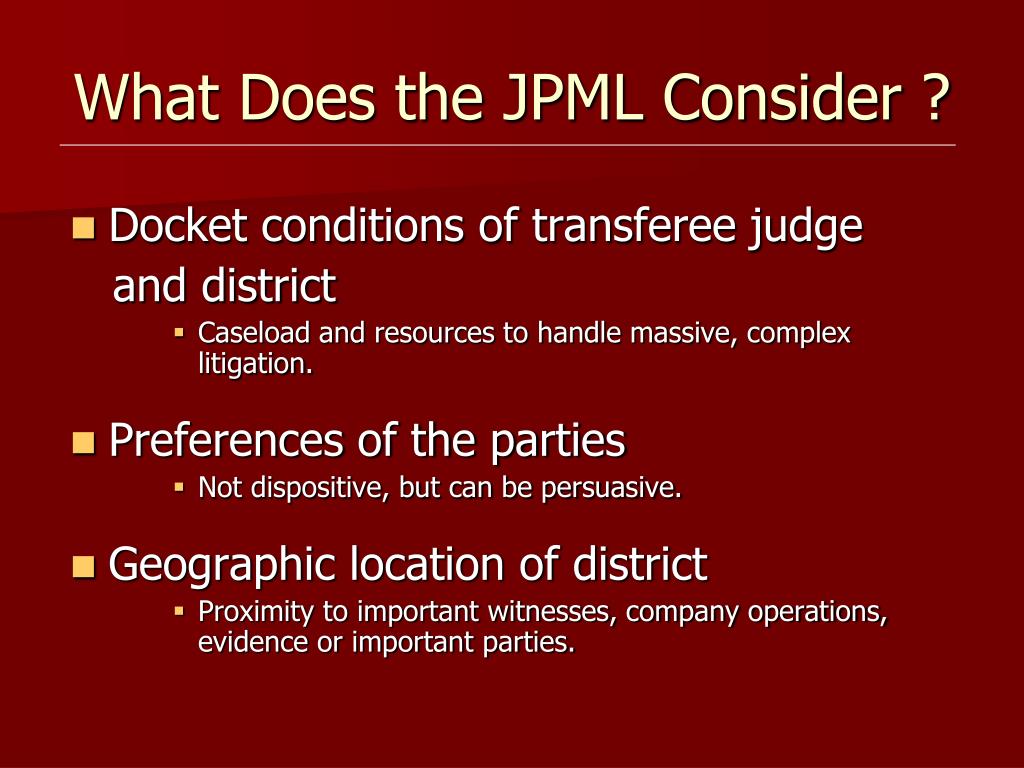 What Does the JPML Consider ? • Docket conditions of transferee judge and district • Caseload and resources to handle massive, complex litigation. • Preferences of the parties • Not dispositive, but can be persuasive. • Geographic location of district • Proximity to important witnesses, company operations, evidence or important parties.