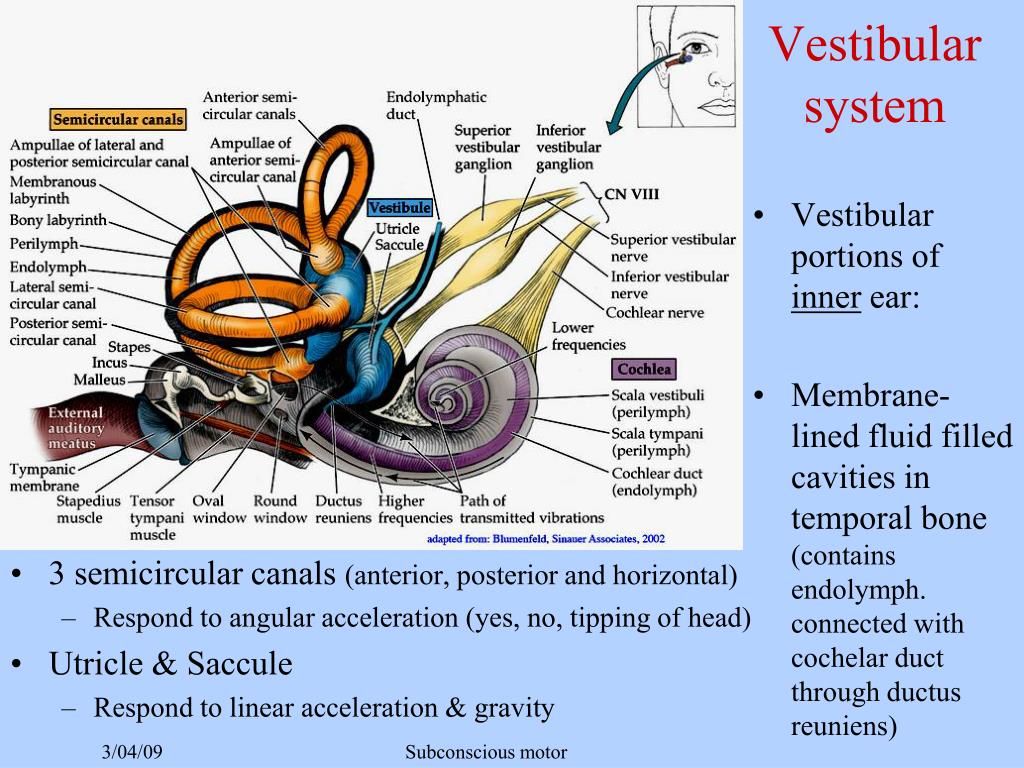 3 semicircular canals (anterior, posterior and horizontal) Respond to angular acceleration (yes, no, tipping of head) Utricle & Saccule Respond to linear acceleration & gravity Vestibular portions of inner ear: Membrane-lined fluid filled cavities in temporal bone (contains endolymph. connected with cochelar duct through ductus reuniens) Vestibular system Subconscious motor