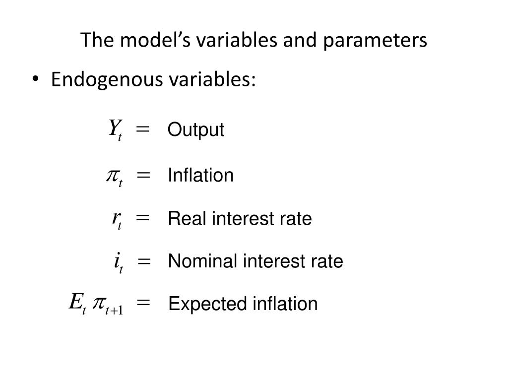 The model’s variables and parameters • Endogenous variables: Output Inflation Real interest rate Nominal interest rate Expected inflation